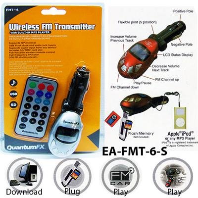FM Wireless TransmitterUSB Flash drive and audio jack inputsSupports audio input from any deviceIncludes SD/USB Flash Drive card slotFull-Function wireless remote controlFull-Frequency FM tuner206 FM station presetsAudio device must have standard 3.5mm headphone jackFlexible 5-Postion JointFM WIRELESS Transmitter with Built in Sd & Usb Slot Remote Control Specifications